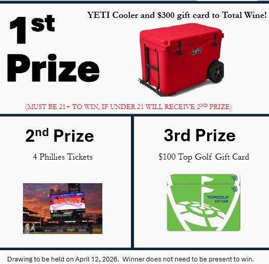 First place is the YETI cooler and a $300 gift card to Total Wine, second place is 4 Phillies tickets and third prize is a $100 Top Golf gift card. Tickets are $10 and the winners will be drawn at the High School banquet on April 12.